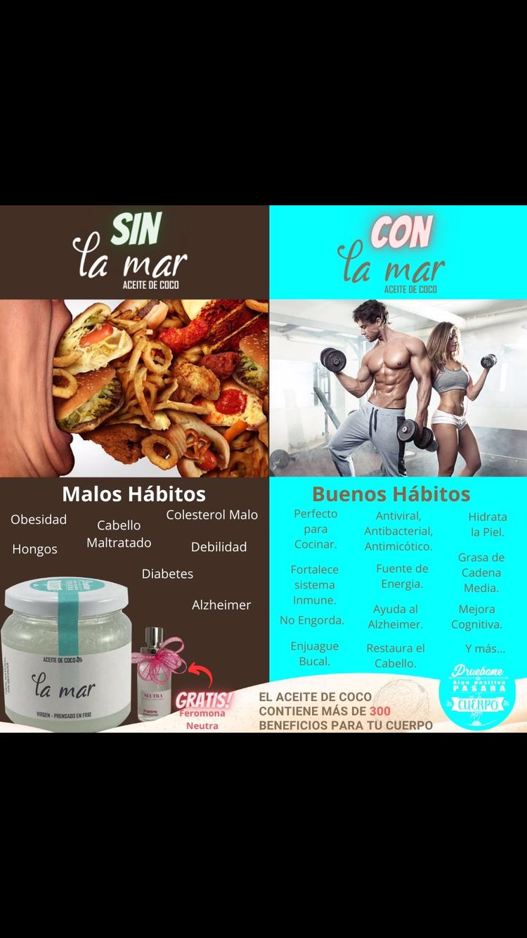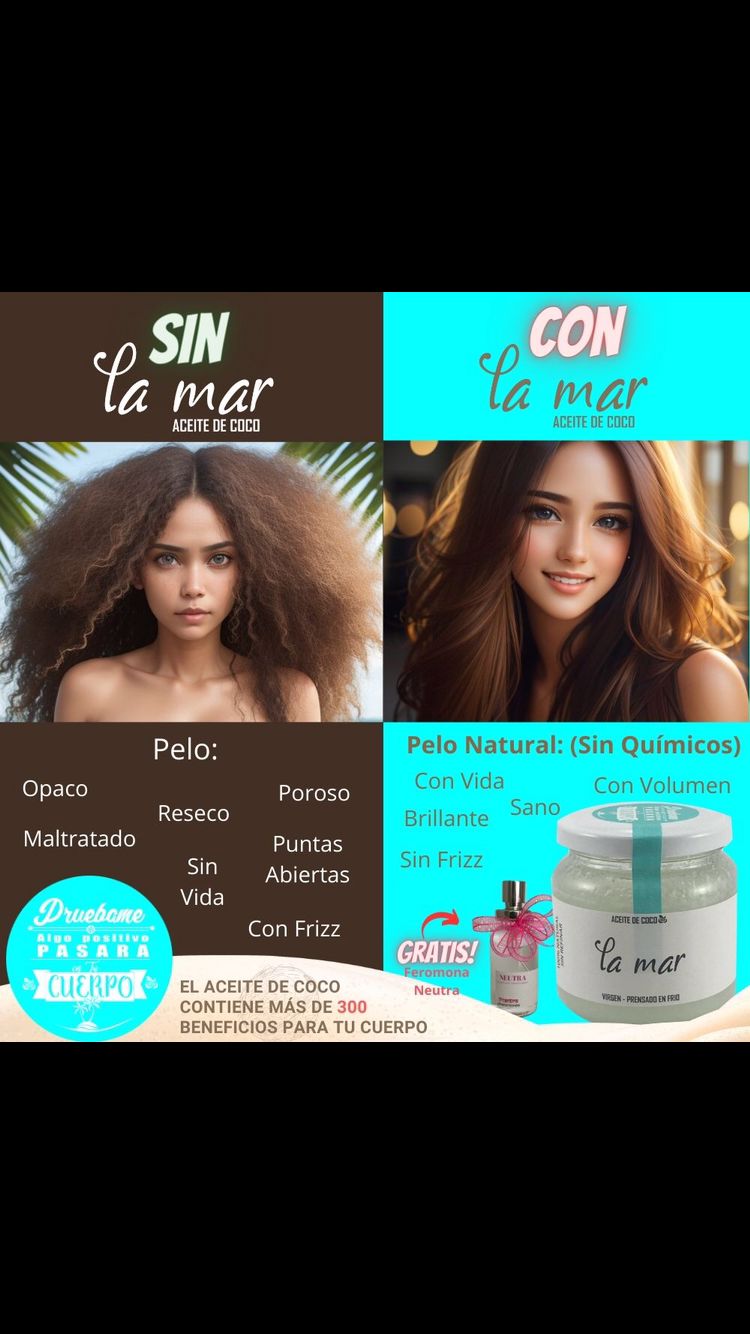 Descubre Aceite de Coco La Mar: Virgen, Prensado en Frío, Natural. Un tesoro natural para tu bienestar. Experimenta la frescura del coco tropical en cada gota. Más que un producto, es un diseño de vida. El Aceite de >Coco La Mar tiene mas de 300 beneficios y usos (pide el PDF) Beneficios: