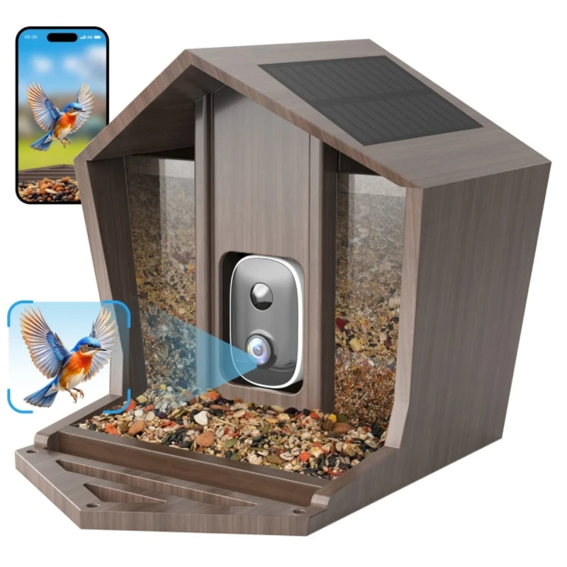 Identificación de aves y cámara HD 2,3 K, Alertas en tiempo real y detección de movimiento, Energía solar y diseño resistente a la intemperie, Construcción de madera duradera y fácil instalación, Para observación de aves y amantes de las aves, asegura que la humedad no se acumule dentro del alimentador.
