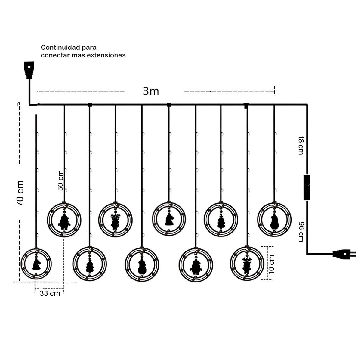 Tamaño Aprox.: Largo: 3 m / Cantidad de tiras: 10 tiras / Caída de la tira: Larga: 70 cm - Corta: 50 cm / Cantidad de luces: 100 LEDS. / Distancia entre tiras: 33 cm.