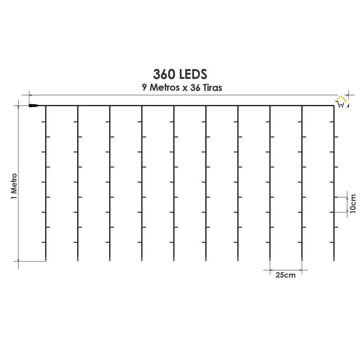Tamaño Aprox.: Largo: 9 m / Cantidad de tiras: 36 tiras / Caída de la tira: 1 m. / Cantidad de luces: 360 LEDS. / Distancia entre tiras: 25 cm.