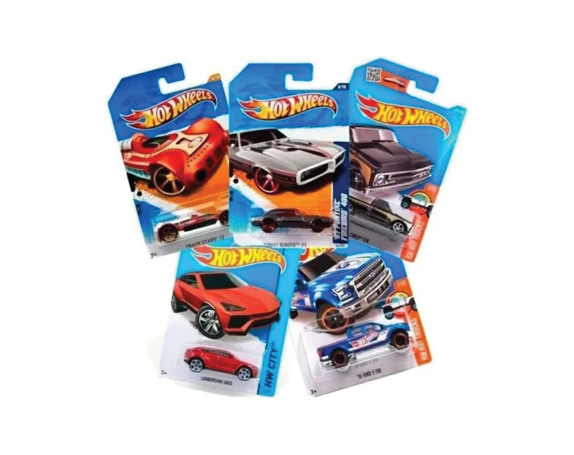 Imagen de referencia, las 5 unidades son enviadas aleatoriamente de la línea básica de calidad de HotWheels.