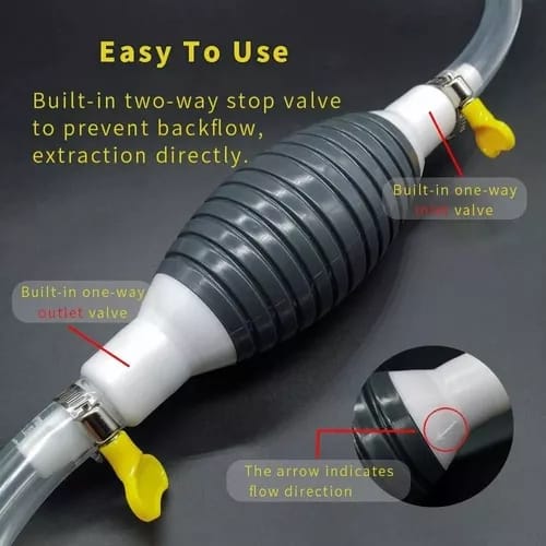 Bomba de sifón manual de alto flujo: con tubo de PVC transparente. Fácil de usar: salida integrada y válvula de entrada para evitar el reflujo, extracción directa, salida de líquido en 5 segundos. La flecha indica la dirección del flujo. Multifunción: bomba de transferencia manual ligera y portátil, ideal para vehículos sin red de filtro antirrobo, como cortacésped, cortador de cepillo, cortasetos, etc. Amplio uso: esta bomba de agua manual es para combustible, gasolina, diésel, aceite, agua y otros líquidos comunes, también puede ser un cambiador de agua para peceras en tu hogar. Nota: el líquido que estás tratando de extraer tiene que ser más alto que el cubo de influencia. El extremo de montaje debe mantenerse dentro del fluido, no solo en la buenficie .Contenido del paquete:1-Bomba manual1-Manguera transparente2-Abrazaderas