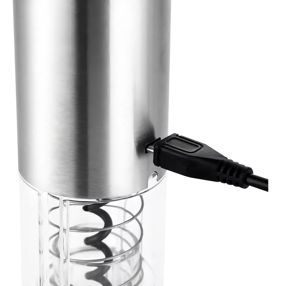Características.- Recargable.- Sacacorchos y conservador de vino inalámbricos.- Abre hasta 30 botellas en una recarga y sella hasta 50.- Extrae automáticamente el aire para crear un vacío en la botella.- Cortador de papel de vino para etiquetas y tapas.- Vertedor para airear y servir.- Incluye dos tapones de goma para mantener el vino fresco de 5 a 7 días.
